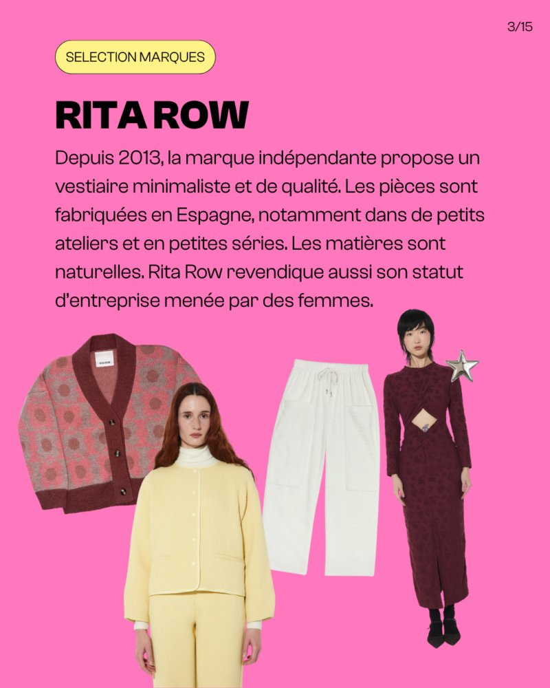 Depuis 2013, la marque indépendante propose un vestiaire minimaliste et de qualité. Les pièces sont fabriquées en Espagne, notamment dans de petits ateliers et en petites séries. Les matières sont naturelles. Rita Row revendique aussi son statut d’entreprise menée par des femmes.