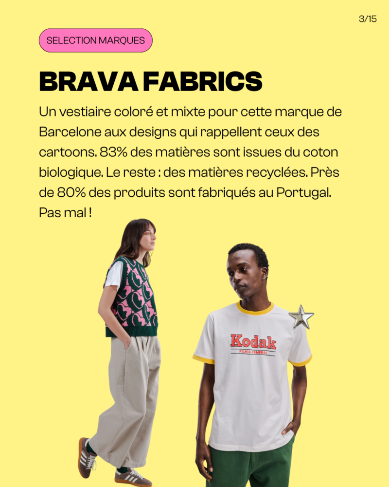 Un vestiaire coloré et mixte pour cette marque de Barcelone aux designs qui rappellent ceux des cartoons. 83% des matières sont issues du coton biologique. Le reste : des matières recyclées. Près de 80% des produits sont fabriqués au Portugal. Pas mal !