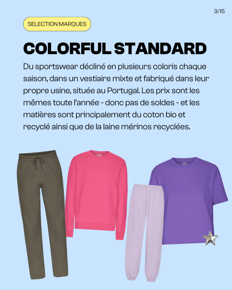 Du sportswear décliné en plusieurs coloris chaque saison, dans un vestiaire mixte et fabriqué dans leur propre usine, située au Portugal. Les prix sont les mêmes toute l’année – donc pas de soldes – et les matières sont principalement du coton bio et recyclé ainsi que de la laine mérinos recyclées.